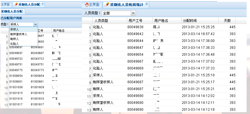 系統中對采制化人員進行了資格認證。采樣人、制樣人、化驗人實現持證上崗,只有具備資質的人才可以做采樣、制樣、化驗操作;系統可查看不同類型人員在崗信息,為建立燃料采制化主要從業人員定期輪崗制度提供支撐。